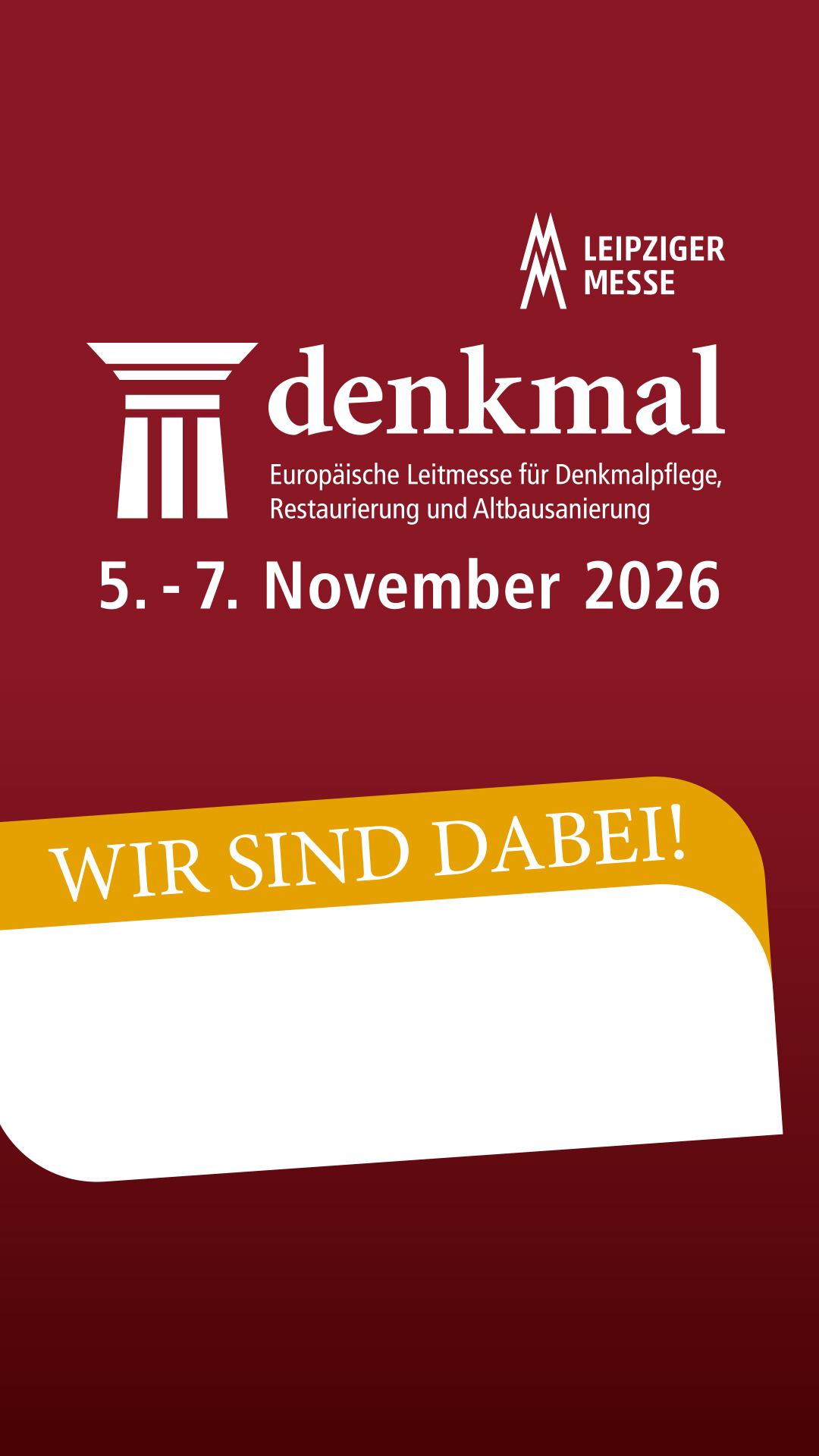 Mit den folgenden Webbannern können Sie auf Ihre Messeteilnahme und Standplatzierung zur denkmal 2026 hinweisen, sodass Ihr Stand von unseren Besuchern schnell gefunden werden kann. Einfach Banner im gewünschten Format herunterladen, Logo und Halle sowie Standnummer einfügen. Das geht am besten mit einem Bildbearbeitungsprogramm, ist aber auch mit Powerpoint oder anderen Programmen leicht umsetzbar.